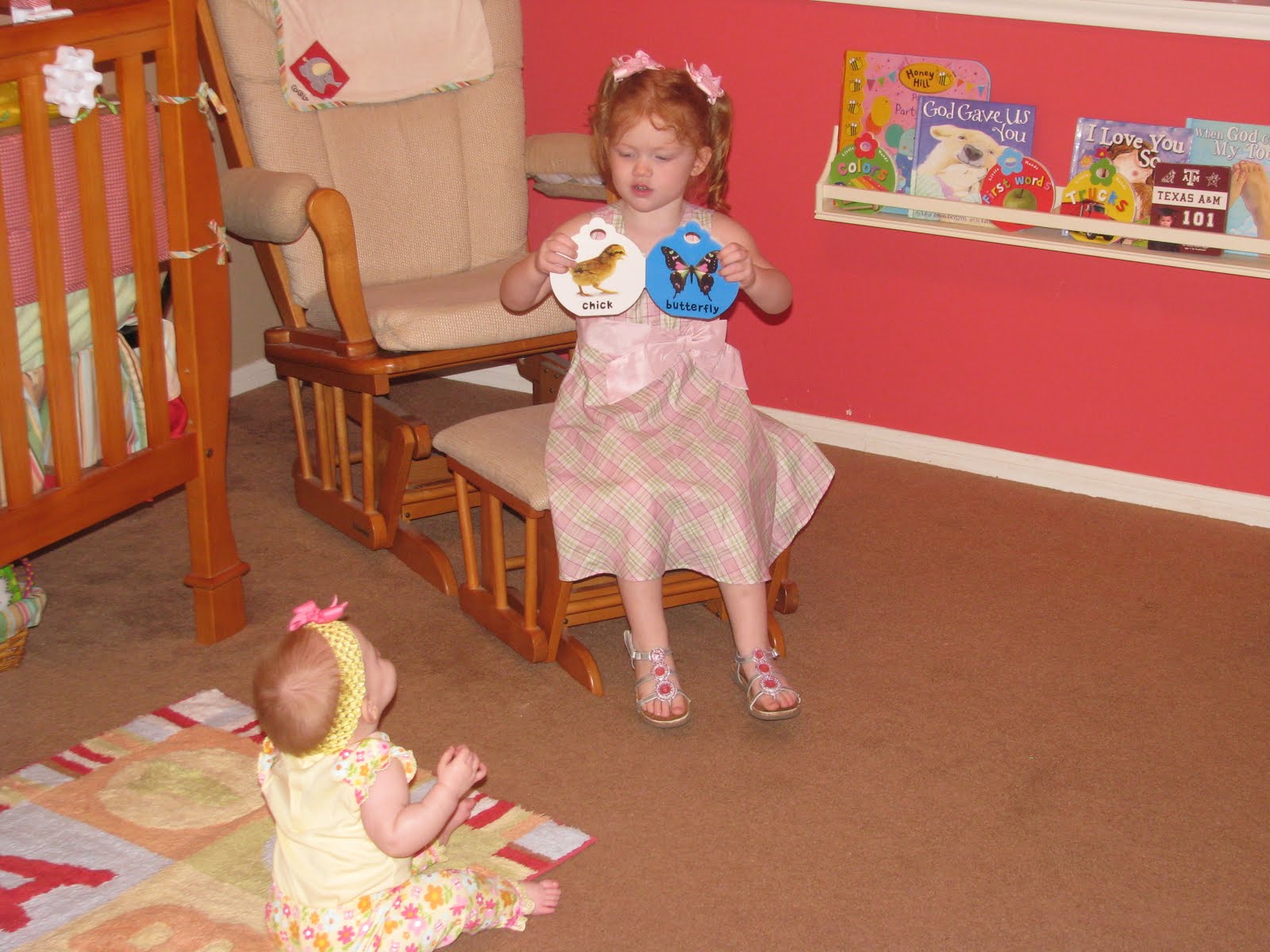 We were getting ready to go somewhere the other day and I had both girls ready and needed to pack our bags. I put Cooper on the floor in her room and asked Kendall if she would entertain her for a minute. She said, "Sure Mom! I will read her a book!"